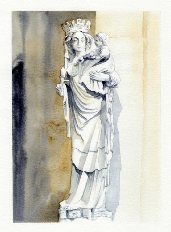 La première partie est consacrée à la Notre-Dame historique, celle que l’on croit connaître par cœur. Marielle Durand s’attache aux lignes, aux volumes, aux détails de pierre, mais aussi à l’atmosphère qui entoure l’édifice : la lumière sur la façade, le rythme des saisons, les silhouettes qui passent au pied des tours. Ces dessins évoquent la continuité d’un monument porté par des siècles de création.